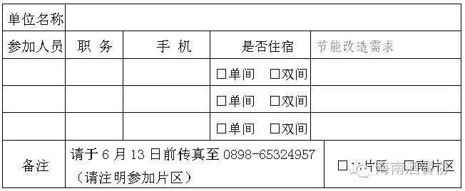 各会员企业及有关单位: 根据“2016年全国节能宣传周和全国低碳日”活动要求,我省将于6月14日和16日分别在南、北片区举办“海南省绿色饭店节能降碳技术产品对接会”。此次活动由海南省科技厅、海南省工信厅、海南省发展改革委、海南省商务厅、海南省旅游委等主办,海南省酒店与餐饮行业协会、海南省绿色饭店工作委员会、海南省节能减排协会、海南省科技企业联合会等承办,是我省2016年节能宣传周和低碳日活动的一项重要活动。届时我省绿色饭店优秀企业将现场交流节能降碳经验,省内外优秀节能服务企业针对节能技术改造、结构调整和能源管理等问题进行技术咨询和交流研讨等,切实将最新的节能改造技术,以点对点的方式为酒店企业进行节能服务。具体事项通知如下: 一、时间和地点 1、北片区会议: 时间:2016年6月14日下午3:00-5:30(2:30签到) 地点:海口希尔顿酒店(龙华区滨海大道109-9号)三楼会议室7-8厅 2、南片区会议: 时间:2016年6月16日下午3:00-5:30(2:30签到) 地点:三亚银泰阳光度假酒店 银泰厅(三亚市大东海旅游度假区海花路88号) 二、活动主题: 智慧酒店、降碳节能 三、会议主要内容 (1)省工信厅负责同志讲话,并对我省酒店业节能改造项目享受政府补助的政策进行解读; (2)省绿色饭店工作委员会主任讲话; (3)省绿色饭店工作委员会领导针对如何全面推进创建绿色饭店工作的部署计划。 (4)绿色饭店代表交流节能降碳典型案例和作法; (5)展示、推广一批适合酒店与餐饮企业进行节能减排改造的新技术新产品展示和讲解。 四、参会人员 有关厅局领导、绿色饭店企业代表、行业协会负责人、酒店与餐饮企业负责人和工程部负责人,节能产品生产、经销企业。 五、其他事项 1、会议免收会务费。 2、如需安排住宿、午餐及参加参观,请在回执表上写明,住宿和餐费自理。 3、有意向展示新技术新产品的企业,请与会务组联系参加细节。 六、联系方式 地址:海口市蓝天路32-2号蓝天丽城8楼 联系人:符史君18689739077 林光海13036080790 王雅婷18876150986 电话:0898-65343645 传真:0898-65324957 海南省酒店与餐饮行业协会 海南省绿色饭店工作委员会 二〇一六年六月二日 海南省绿色饭店节能降碳技术产品对接会参会回执表