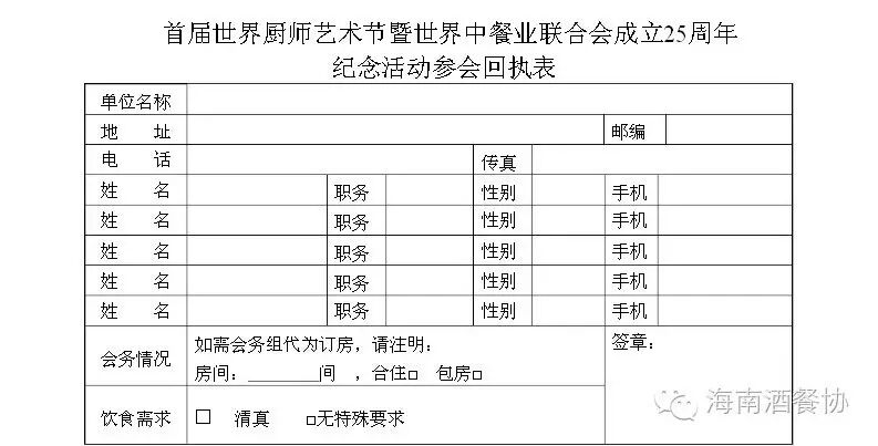 为促进我省酒店餐饮企业及厨师与国际同行的交流,加快与国际餐饮产业的对接互动,搭建国际餐饮对话平台,同时提升我省中餐业在国际餐饮市场的品牌形象和竞争力。海南省酒店与餐饮行业协会和海口市餐饮烹饪行业协会将组团由会长带队参加《2016年首届世界厨师艺术节暨世界中餐业联合会成立25周年纪念活动》,现将世界中餐业联合会《关于举办2016年首届世界厨师艺术节暨世界中餐业联合会成立25周年纪念活动》的通知(世界中餐联发【2016】9号)转发给你们。省酒餐协负责海南省的组织报名工作,请各企业和厨师积极报名参加。
