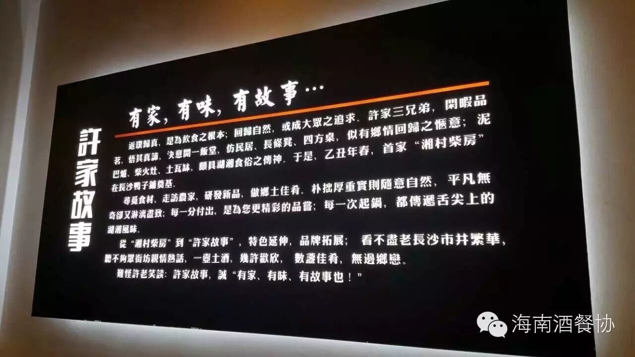 27日上午,海南餐饮考察团走访知名餐饮企业57度湘、海食上,在湖南省餐协周新潮会长、著名餐饮文化大师丁柳生老师陪同下考察了由全国人大代表、中国湘菜大师许菊云先生牵头创办的许家故事餐饮管理公司。受到刘晟董事长、董事刘志慎等高管层的热情接待!许家故事,诚"有家、有味、有故事"。朴拙厚重实则随意自然,平凡无奇却又淋漓尽致,仿民居、长条凳、四方桌、泥巴炉、柴火灶、土甑钵都传递着舌尖上的湖湘风味。