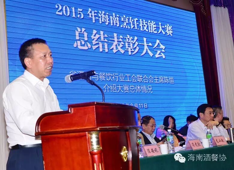 ▲省酒餐协执行会长、省酒餐工会主席陈恒介绍2015年海南烹饪技能大赛总体情况