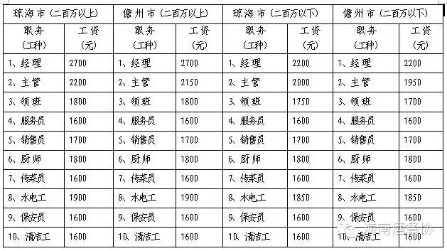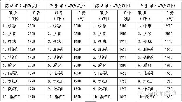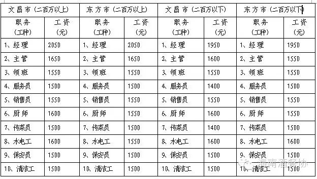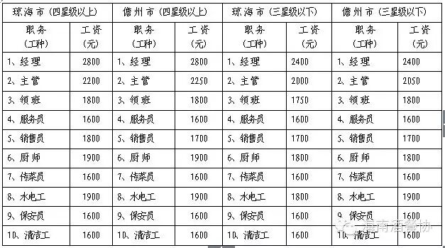 《海南省人民政府关于调整最低工资标准的通知》(琼府[2016]25号)精神,结合我省经济发展情况、职工平均工资、城镇居民消费价格指数和就业状况,为解决因物价上涨等因素带来的民生问题,确定2016年海南省酒店与餐饮行业工资最低工资标准为:在2013年海南省酒店与餐饮行业最低工资标准的基础上,一类地区增长22个百分点,二类地区增长28个百分点,三类地区增长30个百分点;在海南省最低工资标准的基础上,一类地区增长15个百分点,二类地区增长20个百分点,三类地区增长17个百分点。(2016年5月1日起海南省最低工资标准:海口市、三亚市、洋浦经济开发区一类地区,职工最低工资标准为1430元;琼海市、儋州市二类地区职工最低工资标准为1330元;文昌市、五指山市、万宁市、东方市、定安县、屯昌县、澄迈县、临高县、乐东县、琼中县、保亭县、陵水县、白沙县、昌江县等三类地区,职工最低工资标准为1280元)