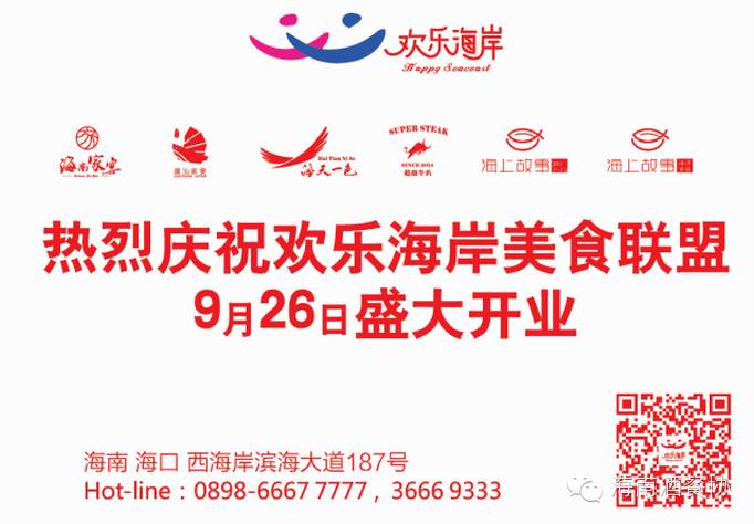 2015年9月26日,在灿烂的金秋时节,海南餐饮界迎来了一位怀揣着远大理想的闯入者,她置身于海口市标志性坐标——西海岸内,与假日海滩、印象海南隔路相望。欢乐海岸美食联盟,这个人们听起来暂时还很陌生的名字,即将在这个金秋时节家喻户晓。成为西海岸的新坐标?欢乐海岸的夙愿绝非那么简单,她立誓要成为的是海南人民寻访美食的终点。
