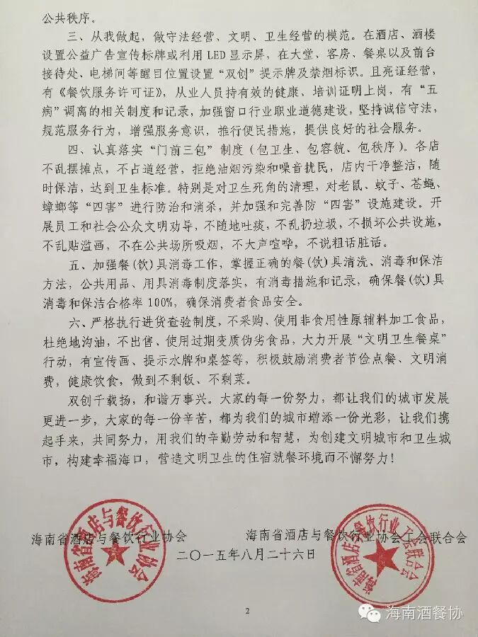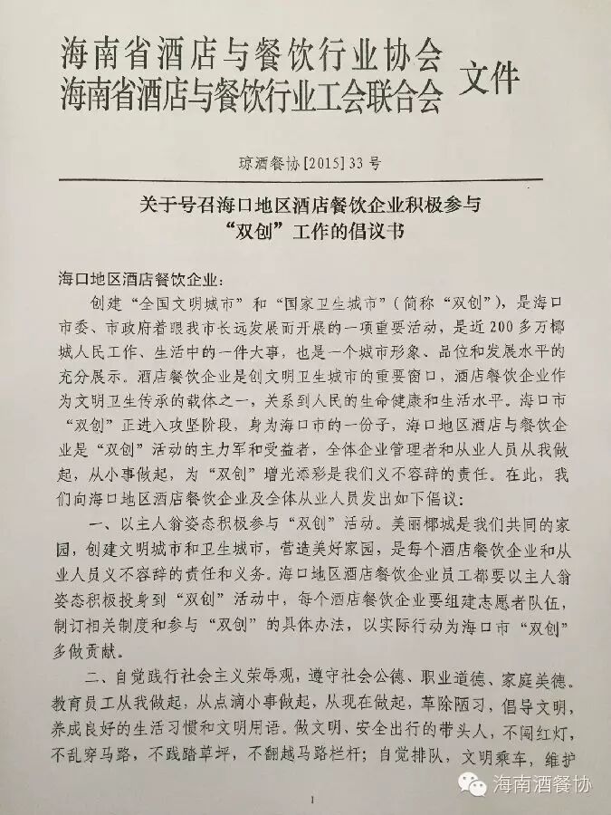海口市“双创”工作正进入攻坚阶段,酒店餐饮企业和行业职工为文明卫生传承的重要载体之一,是创建文明卫生城市重要的窗口和排头兵,更是“双创”活动的主力军和受益者。行业协会和行业工会向海口地区的餐饮酒店企业倡议以主人翁姿态积极参与“双创”活动。一、要求每个企业组建志愿者队伍,制定相关工作方案,以实际行动为海口“双创”做出贡献。二、自觉践行社会主义荣辱观,遵守社会公德,职业道德,教育员工从点滴小事做起,从现在做起,革除陋习、倡导文明。三、做守法经营,文明、卫生经营的模范企业。四、认真落实门前“三包”制度,营造整洁、文明、优美的经营环境。五、加强食品卫生监管制度的落实和确保消费者的食品安全。