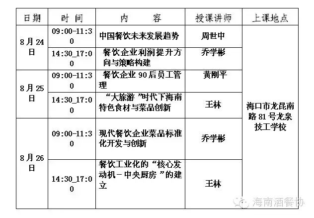 为进一步提高我省酒店与餐饮企业厨师从业人员的技术水平和管理水平,提升厨师从业人员的职业发展能力,满足我省酒店与餐饮行业发展要求,海南省酒店与餐饮行业协会和海南龙泉技工学校特邀四川旅游学院烹饪学院专家前来海口举办第二期“厨师管理技能提升培训班”。现将有关事宜通知如下: