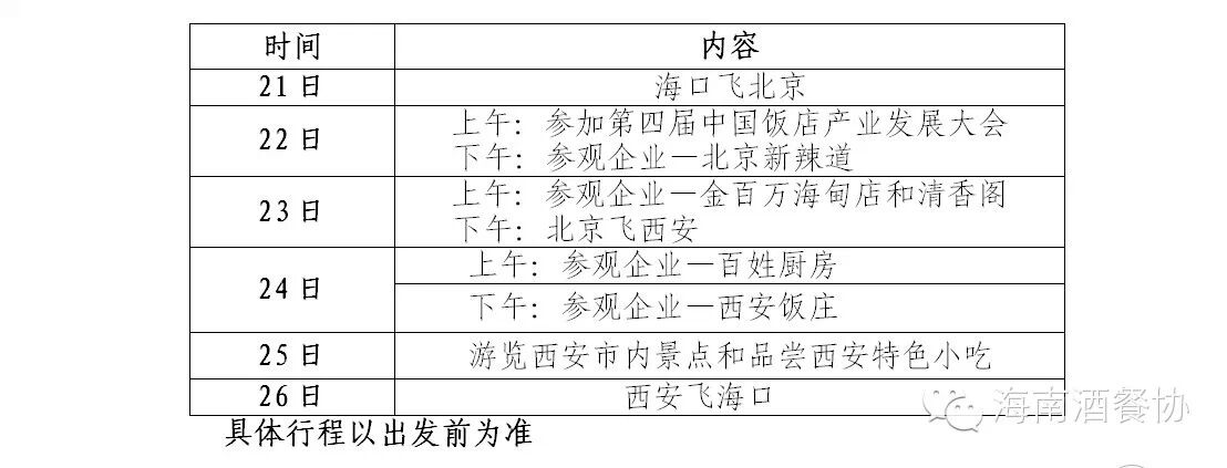 北京是中国政治中心、文化中心,是中国著名的六大古都之一,是中外名菜、名食、名饮荟萃的著名美食之城;西安作为丝绸之路的起点,作为一个在全国乃至全世界著名的旅游城市,西安饮食文化和全国各大菜系比较,文化味更强、更厚重;海南是21世纪海上丝绸之路的重要战略支点,国家实施“一带一路”战略为海南提供了十分广阔的发展空间。为了更好的学习、借鉴北京和西安两地发展特色餐饮,提高餐饮企业文化品位的成功经验,更好地提升海南酒店与餐饮企业的市场竞争力,推动行业的健康快速发展。应北京和西安两地餐饮行业协会邀请,海南省酒店与餐饮行业协会将于4月21日-26日组织企业赴北京和西安进行考察交流,并参加在北京举办的“第四届中国饭店产业发展大会暨中国饭店文化节”。具体事项通知如下: