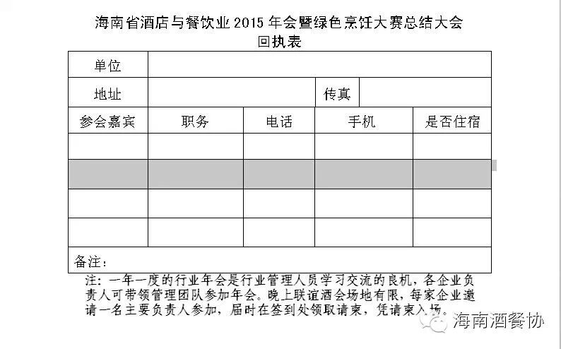 回顾2014年,在国家宏观经济增速放缓以及八项规定,厉行节约等系列举措的作用下,酒店餐饮业进入了深度转型期,这使酒店餐饮行业走过了艰难,不平凡的一年。面对经营成本的不断攀升,酒店餐饮业该如何提升利润空间?酒店餐饮业站在新的历史起点,面对新的机遇和挑战,该如何用我们酒店餐饮人的勇气、智慧和能力,克服挑战、抓住新机遇,实现新梦想?海南省酒店与餐饮行业协会携手行业企业及行业产业链的上下游企业,定于2015年2月3日共聚海口召开“海南省酒店与餐饮行业2015年会暨首届海南绿色烹饪技能大赛总结大会”。年会以“凝聚力量、创新发展”为主题,集主题演讲、工作总结、行业报告、经验交流、产品展示、供需对接、高端活动、表彰先进和新春联谊于一体,致力于搭建资讯交流、洽谈合作、拓宽人脉、整合资源的高端平台,全力推动海南酒店餐饮业持续健康发展。现将有关事项通知如下: