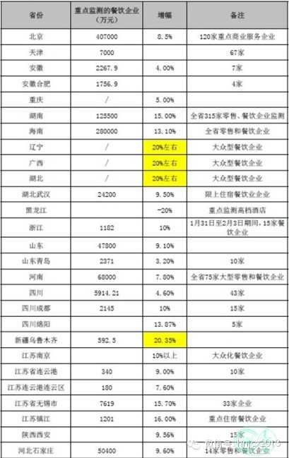 从各地商务部门公布的监测数据来看,监测的大众化餐饮企业在春节黄金周期间的增幅普遍在15%以上,而包括中高端餐饮企业的监测数据平均增幅在10%左右。具体数据见表1。