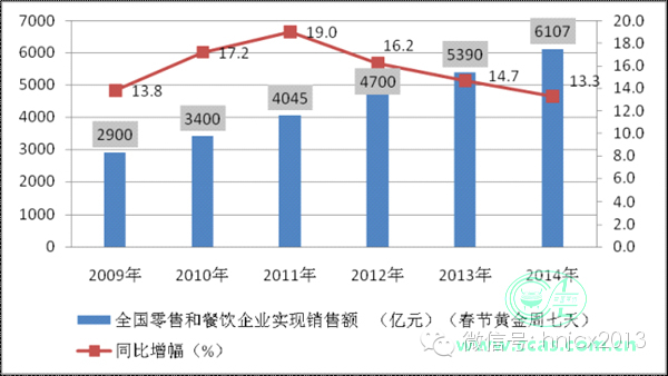 图1. 2009-2014历年春节黄金周零售和餐饮市场表现