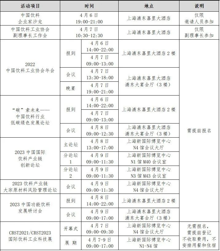 经积极协调,延期举办的“2022中国饮料工业协会年会” “CBST2021/CBST2023国际饮料工业科技展”等系列活动,定于4月7日-9日上海举办。作为中国饮料行业年度盛大交流活动,欢迎饮料产业链企业及各界嘉宾积极参与本次活动,开展行业交流、共促行业发展。现将系列活动有关事宜通知如下:
