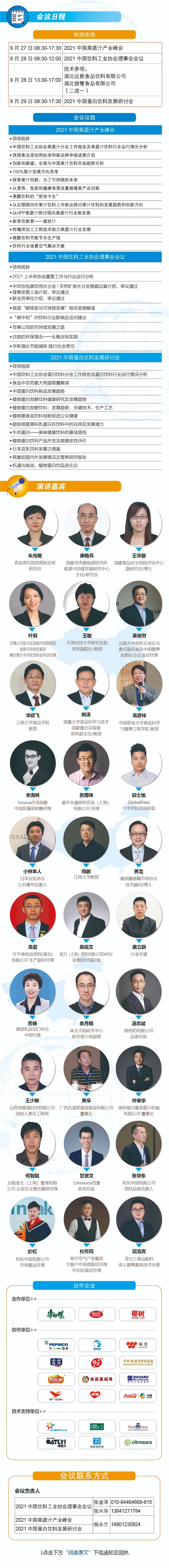 “2021中国饮料工业协会理事会会议”“2021中国果蔬汁产业峰会”“2021中国蛋白饮料发展研讨会”将于9月27-29日在湖北武汉召开,届时将有30余位演讲嘉宾与您共商饮料行业创新发展之路,现将会议日程、会议议题、演讲嘉宾等信息公布如下,敬请关注。