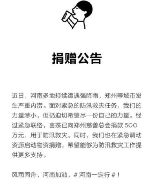 经过紧急联络,喜茶已向郑州慈善总工会捐款500万元,用于防汛救灾。同时,喜茶也在紧急调动资源启动物资捐赠,希望能够为防汛救灾工作提供更多支持。