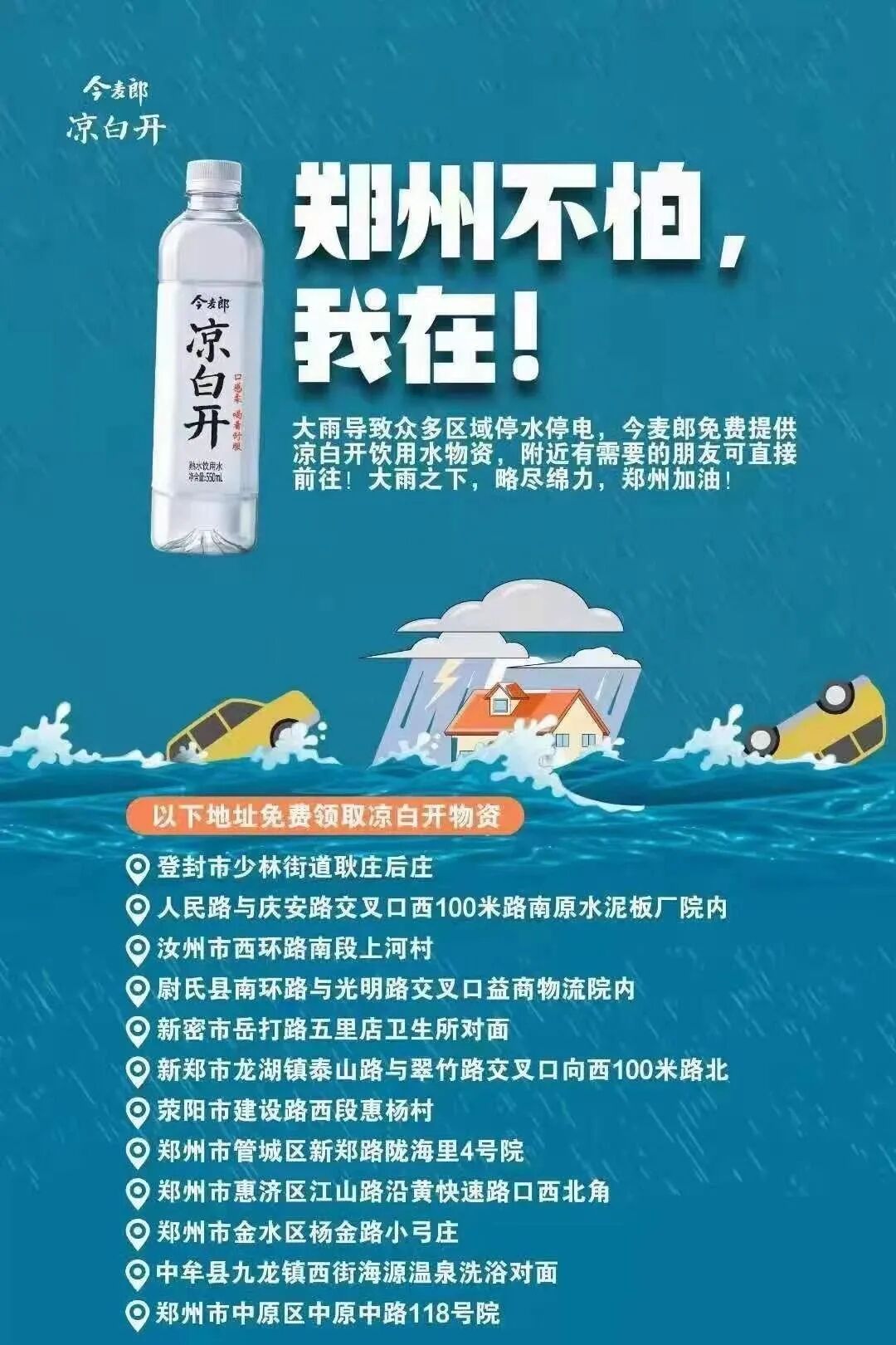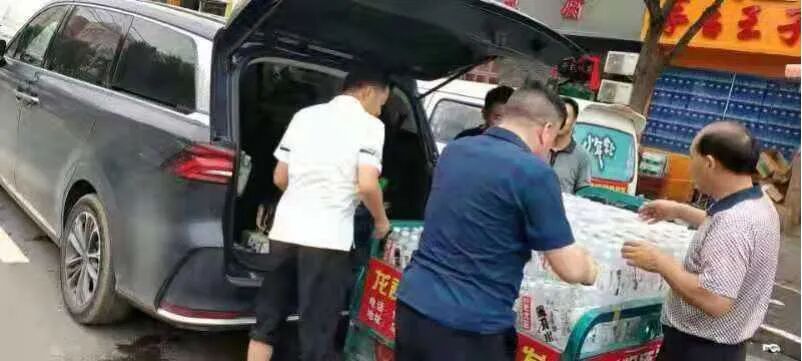 今麦郎在河南多地开设站点,为受灾地区群众免费提供凉白开饮用水。