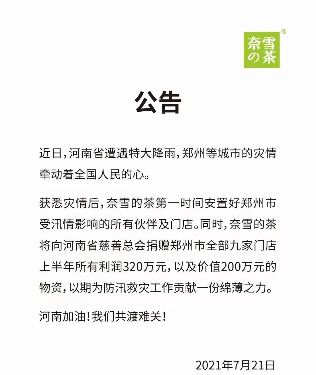 奈雪的茶将向河南省慈善总工会捐赠郑州市全部九家门店上半年所有利润320万元,以及价值200万元的物资,为防汛救灾工作贡献一份绵薄之力。饮料行业将持续关注河南汛情及一线救援情况,尽自己的一份力量,与河南共度难关。在此,呼吁更多有爱心的社会力量参与到驰援河南、驰援郑州的队伍中来,彰显一方有难、八方支援的中国精神。