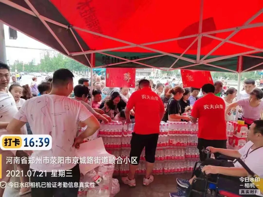 农夫山泉第一时间调拨一万箱水用于帮助郑州和其他受灾地区市民。同时农夫山泉组织了员工和经销商送水至福利院、安置点等地,竭尽全力为受困群众及救援人员提供力所能及的帮助。