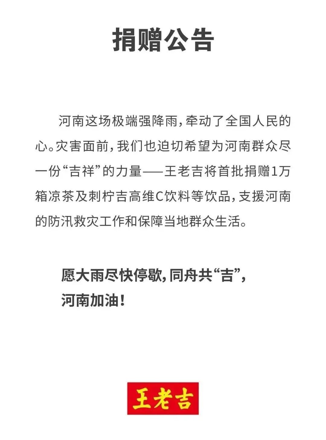 王老吉首批捐赠了1万箱凉茶及刺柠吉高维C饮料等饮品,支援河南的防汛救灾工作和保障当地群众生活。