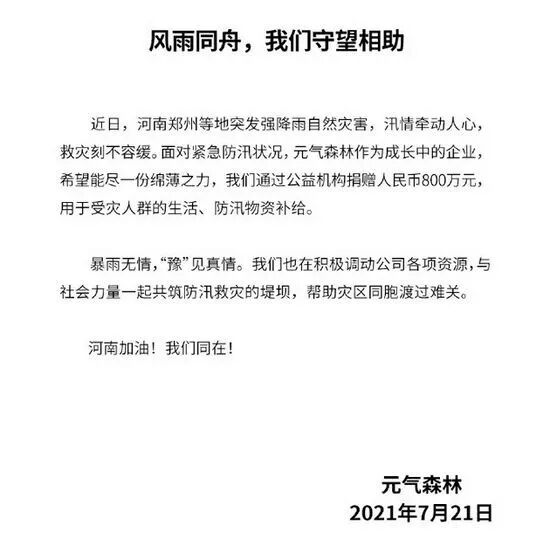 元气森林通过公益机构捐赠人民币800万元,用于受灾群众的生活、防汛物资补给。