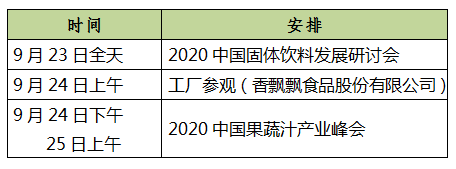 将于9月23-24日在浙江湖州召开的 “2020中国固体饮料发展研讨会” 是固体饮料行业专题研讨会。目前,会议报告议题和专家、会议日程安排等已基本落实。同期还将召开“2020中国果蔬汁产业峰会”。现将会议具体事宜通知如下,请有关人员预留参会时间,敬请尽早填写附件参会回执,并于9月7日前返回协会。