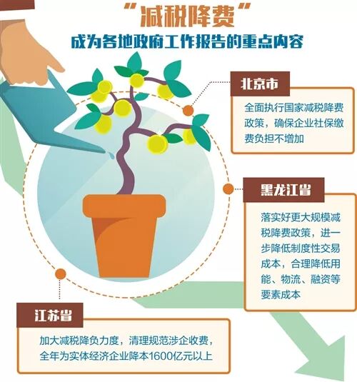 党中央、国务院高度重视减税降费工作,在以前年度推出一系列减税降费举措基础上,中央经济工作会议对2019年实施更大规模减税和更明显降费提出了明确要求。在今年年初各省区市举行的两会上,“减税降费”成为各地政府工作报告的重点,通过明确一系列举措,确保减税降费政策措施落地生根。