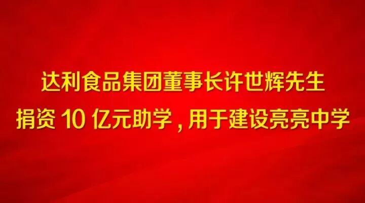 2017年11月6日,达利食品集团董事长许世辉先生捐资10亿人民币支持家乡教育事业,将在家乡惠安县创建一所富有国际视野的综合型、全方位、高教育质量的现代化一流中学,学校命名为亮亮中学!其中,7亿元用于新学校建设;3亿元用于建立亮亮中学奖学、奖教、助学基金,激励广大教育工作者潜心教育、创先争优,激发学生勤学苦读、不断进取!学校建设完成后捐赠惠安县人民政府管理。