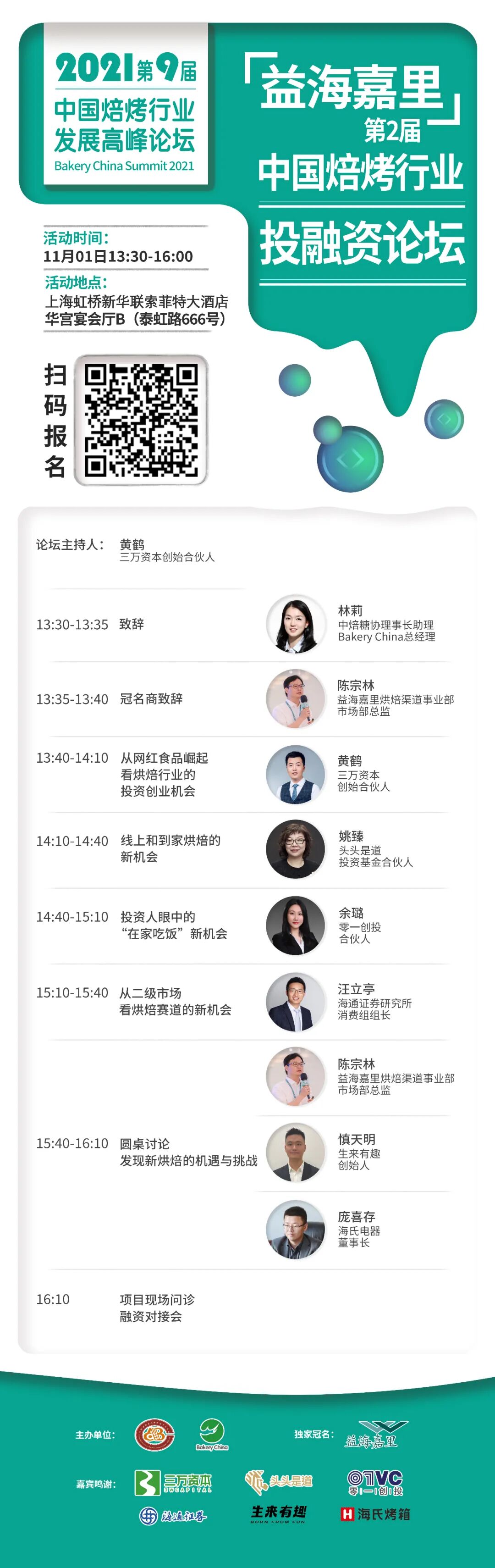 本次论坛聚焦焙烤行业投融资话题,特邀头头是道、三万资本、零一创投、海通证券研究所创始人/高管出席论坛分享互动;特增项目现场问诊——融资对接会,为品牌和资本搭建对话桥梁,助力行业健康快速成长。