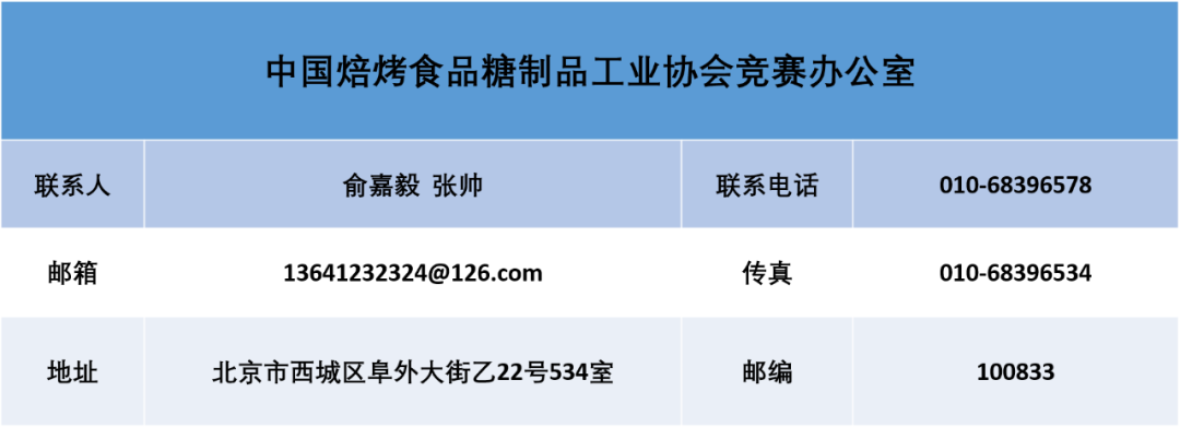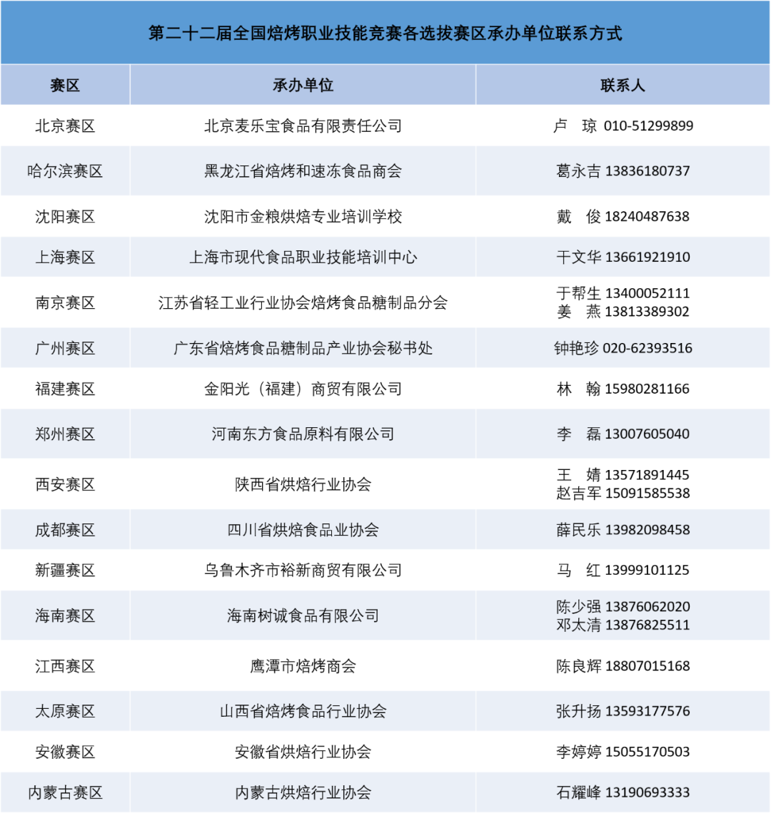 由中国轻工业联合会、中国焙烤食品糖制品工业协会与中国就业培训技术指导中心、中国财贸轻纺烟草工会全国委员会联合举办的全国焙烤职业技能竞赛自2000年首次举办以来,已经逐步成为行业内规模最大、影响力最深、权威性最高的竞赛活动。日前,2021年全国行业职业技能竞赛——第二十二届全国焙烤职业技能竞赛各分赛区预选赛报名工作已经启动。本届竞赛共设“维益杯”全国装饰蛋糕技能比赛、“顺南食品杯”全国月饼技能比赛、“安琪酵母杯”全国面包技能比赛三个项目。赛事依旧保持个人赛、团体赛两种竞赛形式,但各项目细则均有不同程度的修订。本届竞赛将于6月至10月举办,全国共设十六个赛区,在符合大赛总体安排的前提下,各分赛区自行确定所在区域选拔赛的举办时间和相关工作安排。详情请向所在赛区承办单位咨询,联系方式如下: