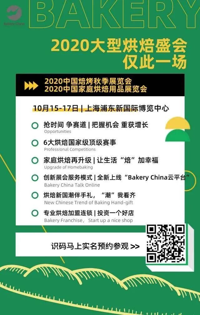 2020年10月15-17日,中国秋季焙烤展&家庭烘焙展与您继续相约上海浦东新国际博览中心,信守我们的年度之约!识别下图二维码,马上实名预约参观。
