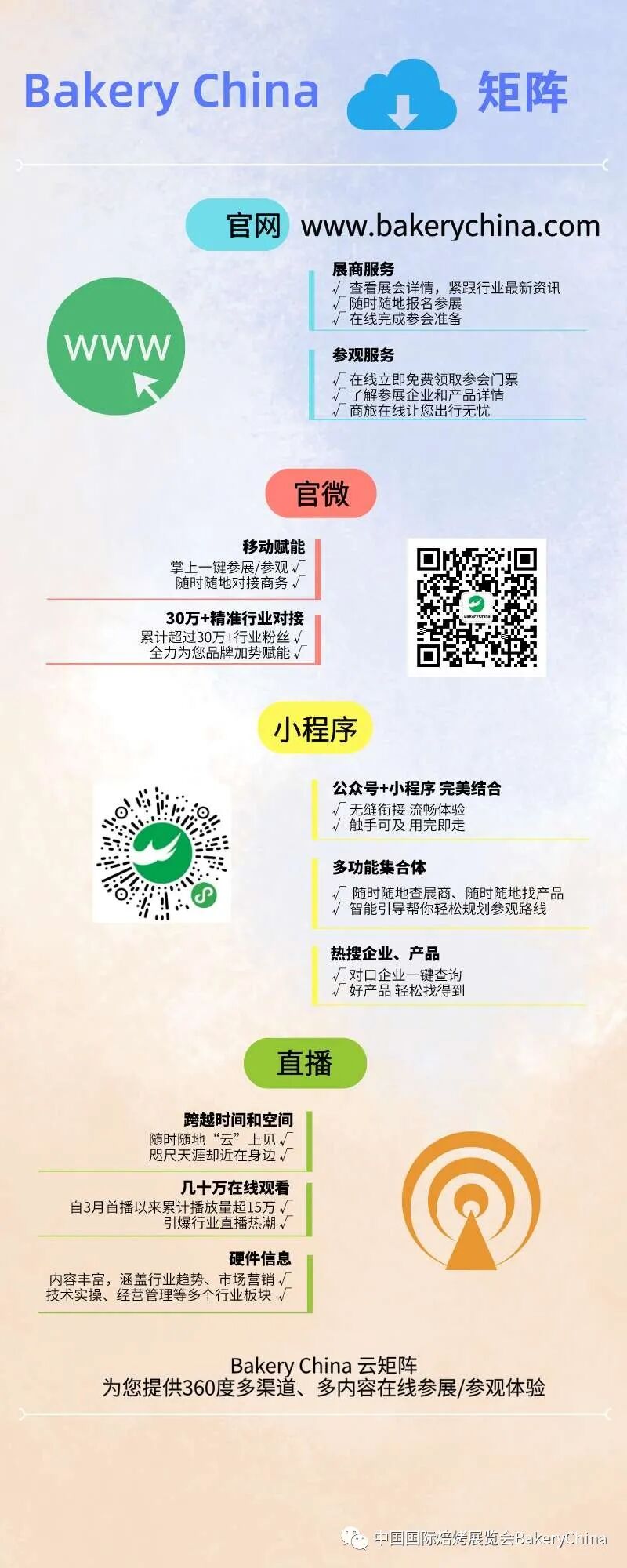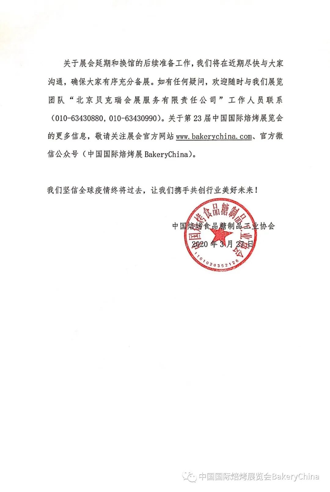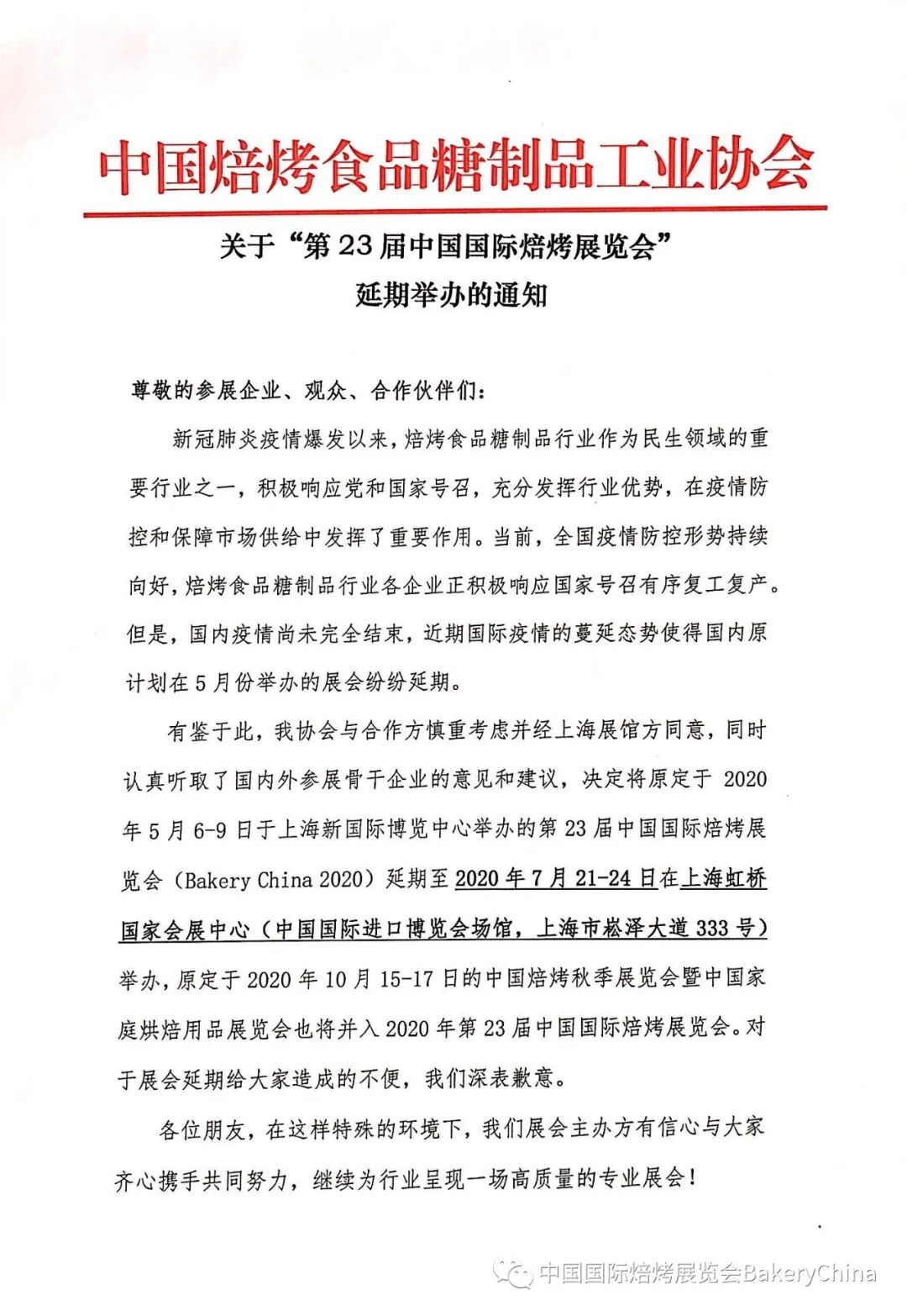 你我定不负这韶华之约中国国际焙烤展览会(Bakery China)作为全球领先的焙烤行业盛会,每年吸引着来自全球各地的行业人才济济一堂,共襄盛举。当前,全国疫情防控形势持续向好,焙烤食品糖制品行业各企业正积极响应国家号召有序复工复产。但是,国内疫情尚未完全结束,近期国际疫情的蔓延态势使得国内原计划在5月份举办的展会纷纷延期。有鉴于此,为保障广大参展商和观众参展参观安全与效果,展会主办单位与各合作方慎重考虑并经上海展馆方同意,同时认真听取了国内外参展骨干企业的意见和建议,决定将原定于2020年5月6-9日于上海新国际博览中心举办的第23届中国国际焙烤展览会(Bakery China 2020)延期至2020年7月21-24日在上海虹桥国家会展中心(中国国际进口博览会场馆,上海市崧泽大道333号)举办,原定于2020年10月15-17日的中国焙烤秋季展览会暨中国家庭烘焙用品展览会也将并入2020年第23届中国国际焙烤展览会。若因展会延期给业界同仁带来不便,我们深表歉意,我们将继续全力与业界同仁携手奉献一场高质量的专业盛会!
