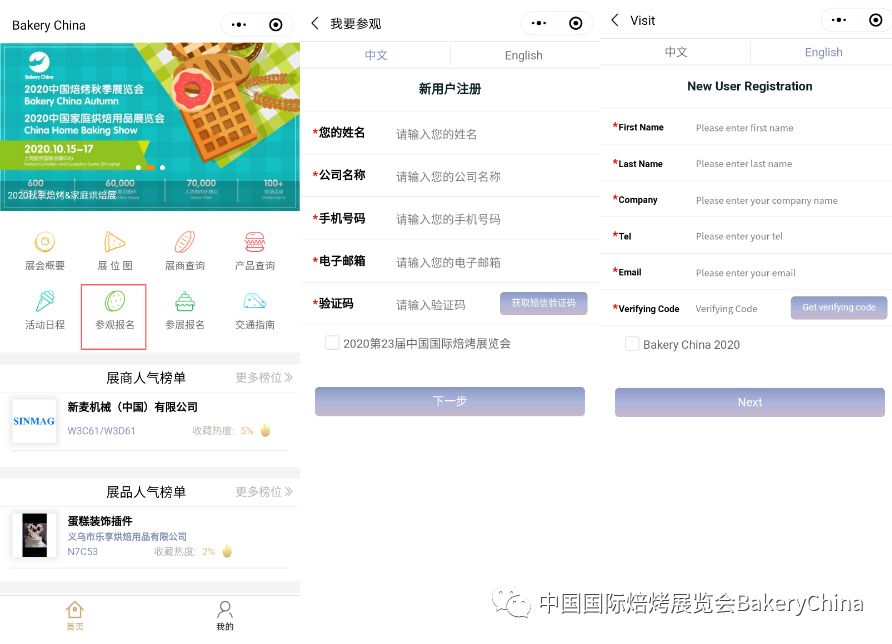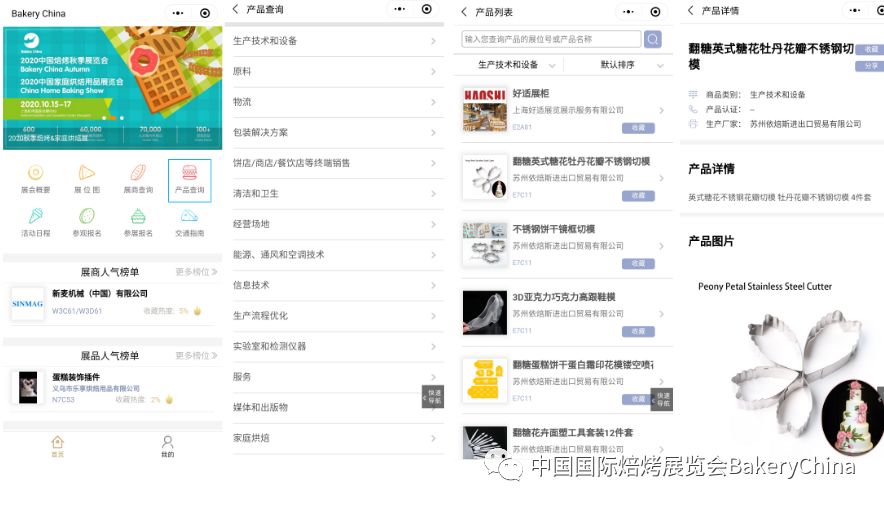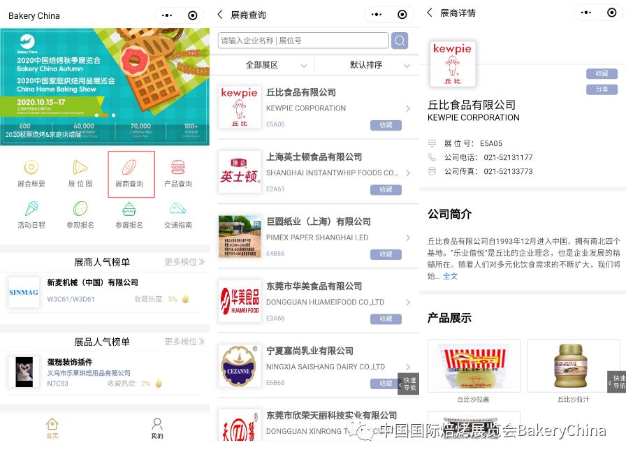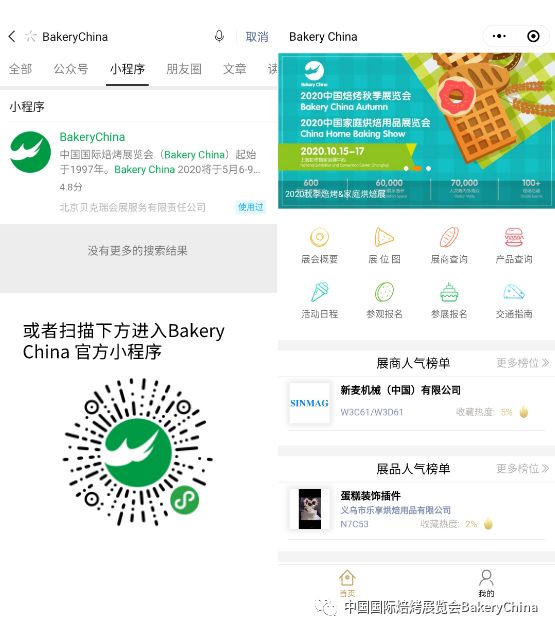 在微信搜索框内输入“BakeryChina”字样或者扫描下图二维码,即可进入Bakery China官方小程序。从左到右就是辣么简单到位。