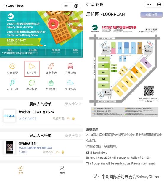 在小程序首页点击【展位图】,进入本届展会详细【功能图】,点击大图您可以详细查看各个服务站点位置及场馆整体布置。点击右上角【查看详情】,欢迎来到Bakery China 2020展会17个正式展厅+数个临时馆(共计超过20万平米)展位图列表。点击任意一个展厅即可查看该展厅高清展位图。从左到右,还是辣么简单到位。