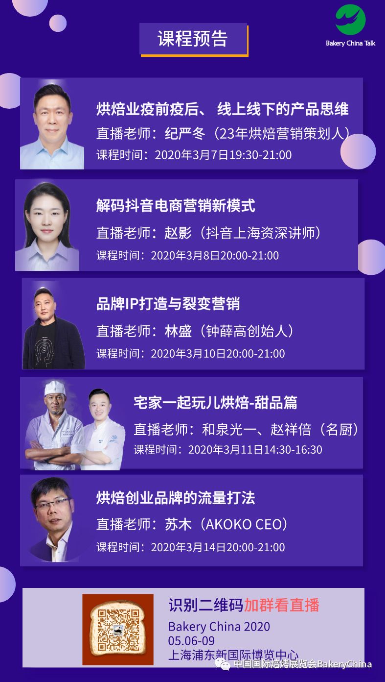 以下是近期在线直播课程表,敬请惠存。与1万+烘焙同仁一起【云】学习【云】互动吧!