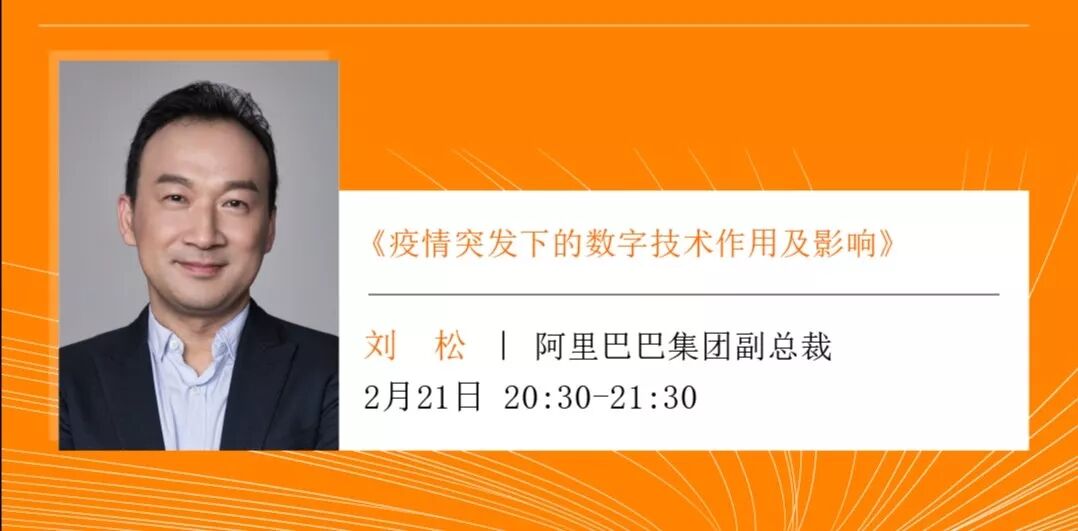 20:30-21:30重磅嘉宾——阿里巴巴集团副总裁刘松将受邀带来《疫情突发下的数字技术作用及影响》。