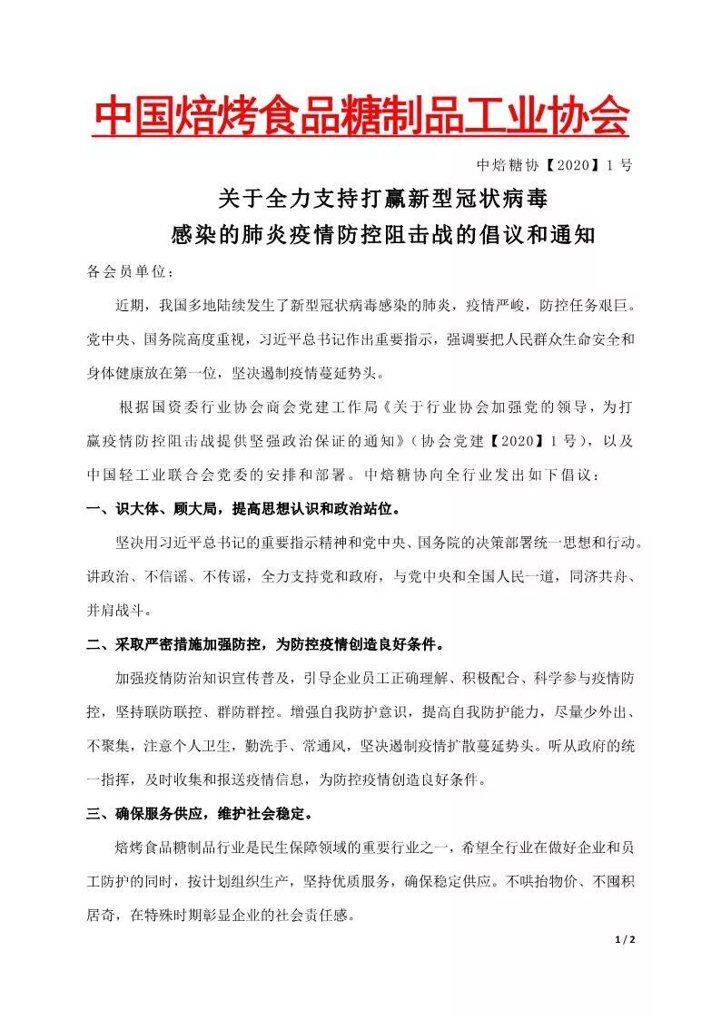 近期,我国多地陆续发生了新型冠状病毒感染的肺炎,疫情严峻,防控任务艰巨。在以习近平同志为核心的党中央坚强领导、全国上下戮力同心、共克时艰的关键时刻,中焙糖协向全行业发出如下倡议: