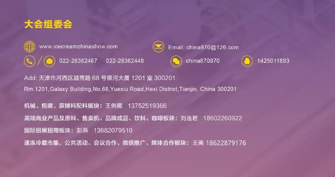 第23届中国冰淇淋产业博览会已确定于2020年10月12(一)-14日(三)举办。敬请随时关注大会官网和微信公号内容!报名参展请致电联络以下主办方.