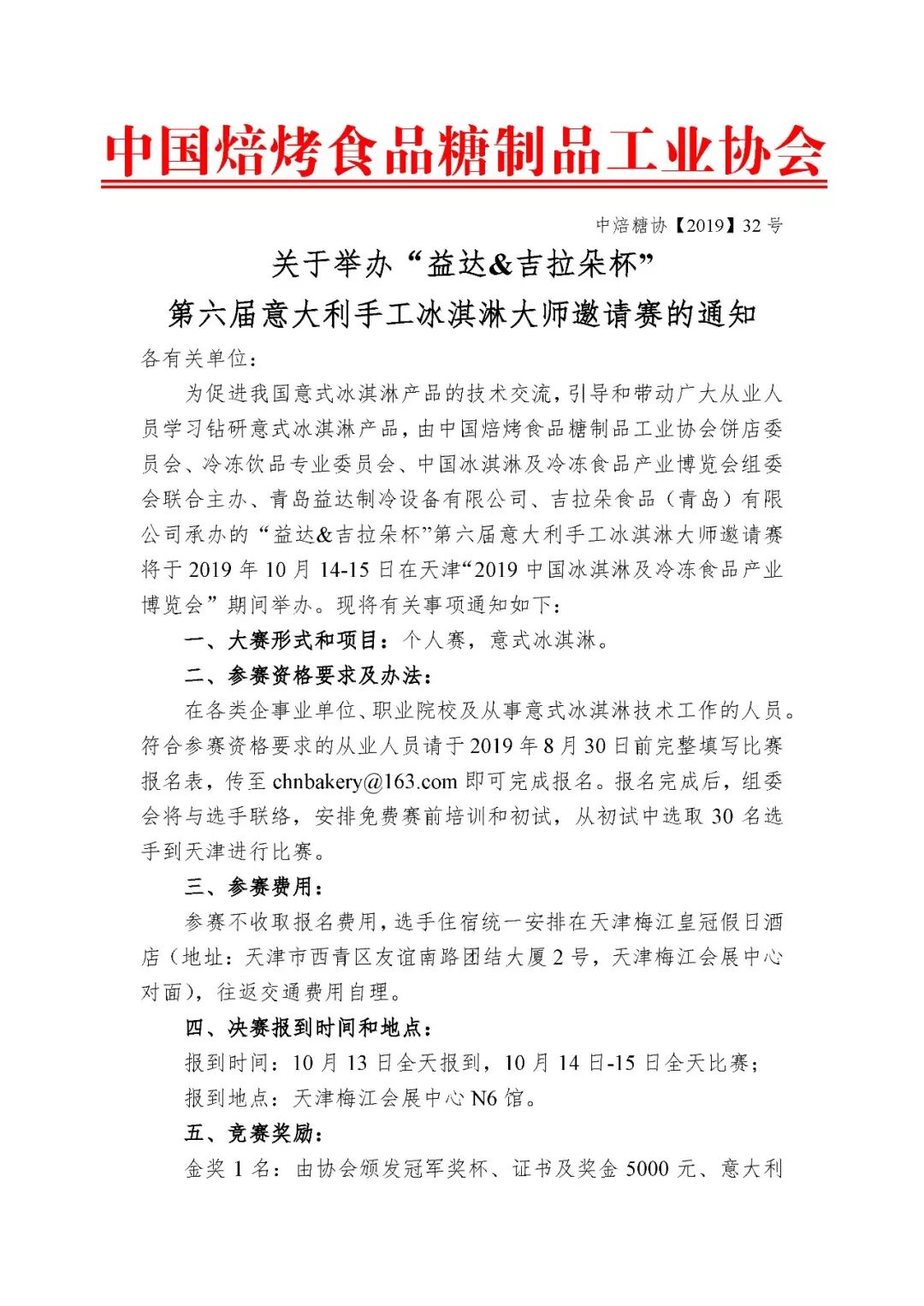 为促进我国意式冰淇淋产品的技术交流,引导和带动广大从业人员学习钻研意式冰淇淋产品,由中国焙烤食品糖制品工业协会饼店委员会、冷冻饮品专业委员会、中国冰淇淋及冷冻食品产业博览会组委会联合主办,青岛益达制冷设备有限公司、吉拉朵食品(青岛)有限公司冠名承办的“益达&吉拉朵杯”第六届意大利手工冰淇淋大师邀请赛正在报名中,欢迎广大从业者和爱好者报名参加!