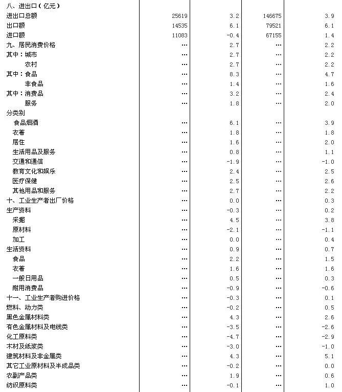 上半年,全国居民消费价格同比上涨2.2%,涨幅比一季度扩大0.4个百分点。其中,城市和农村均上涨2.2%。分类别看,食品烟酒价格同比上涨3.9%,衣着上涨1.8%,居住上涨2.0%,生活用品及服务上涨1.1%,交通和通信下降1.0%,教育文化和娱乐上涨2.5%,医疗保健上涨2.6%,其他用品和服务上涨2.2%。在食品烟酒价格中,粮食价格上涨0.5%,猪肉价格上涨7.7%,鲜菜价格上涨9.2%。扣除食品和能源价格后的核心CPI同比上涨1.8%,涨幅比一季度回落0.1个百分点。6月份,全国居民消费价格同比上涨2.7%,涨幅与上月持平;环比下降0.1%。