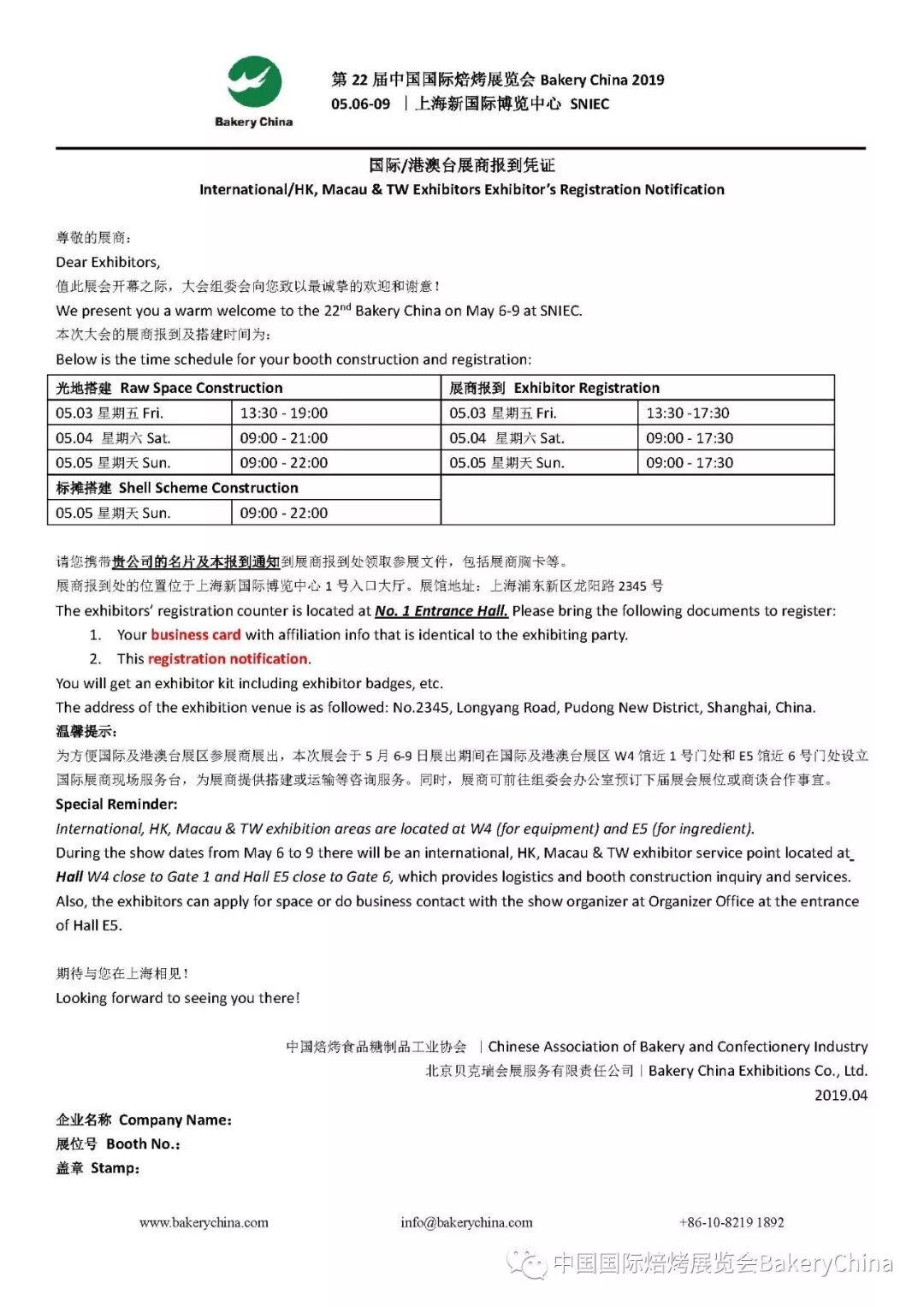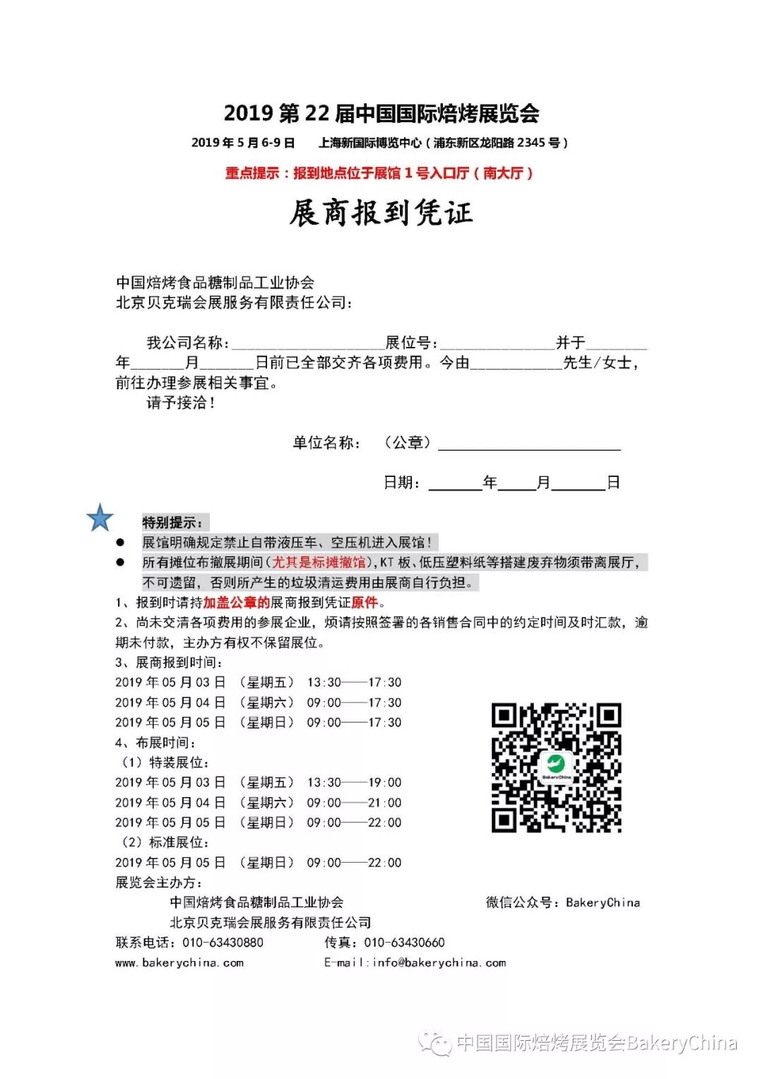 Bakery China 2019本届展会参展企业在5月3-5日展台搭建期间可以至展馆1号入口大厅(南大厅),凭签字盖章的《展商报到凭证》领取展商胸卡等材料。