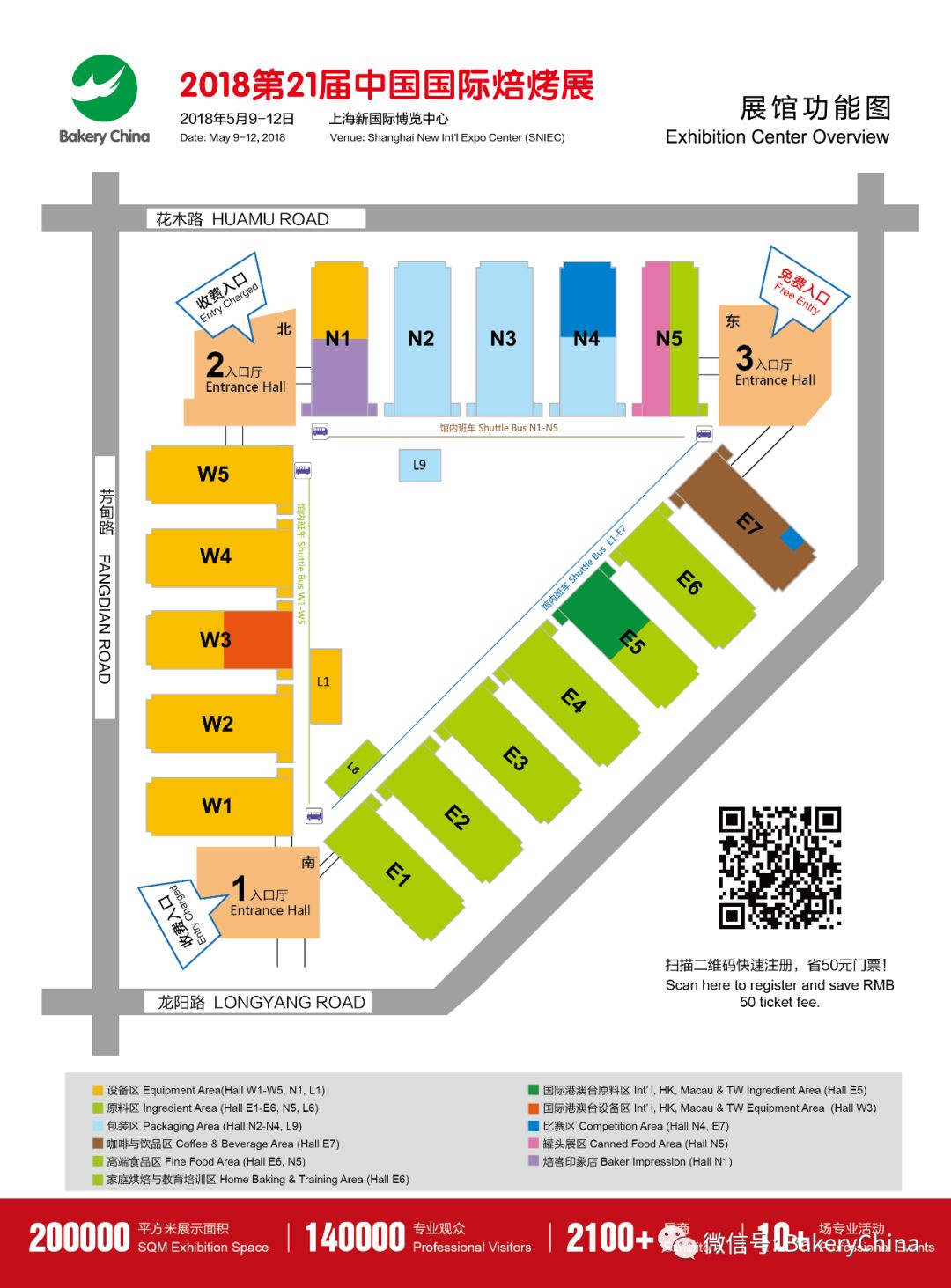 为了方便海内外客商的高效参观采购,Bakery China 2018按照参展企业的展示产品持续优化提升专业分区布局:E1-6、N5为原料展区,其中E5为国际原料展区;E7为咖啡、饮料、高端食品展区;W1-5, N1为设备展区,其中W3为国际设备展区;N2-4为包装展区;N4为比赛区。