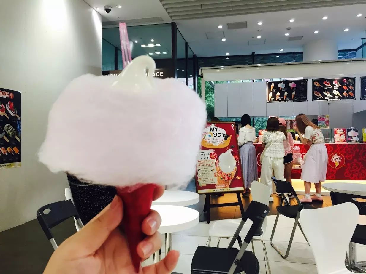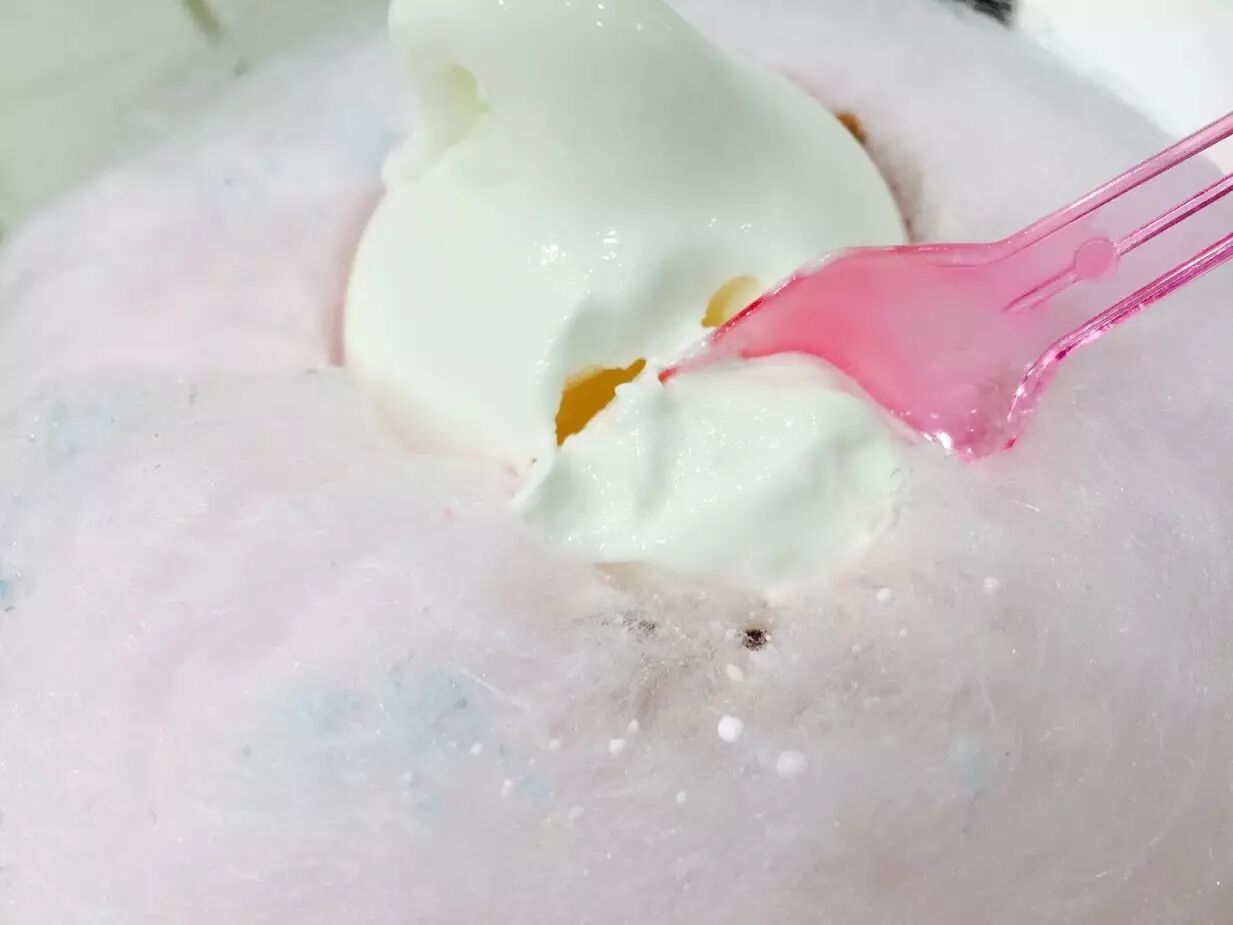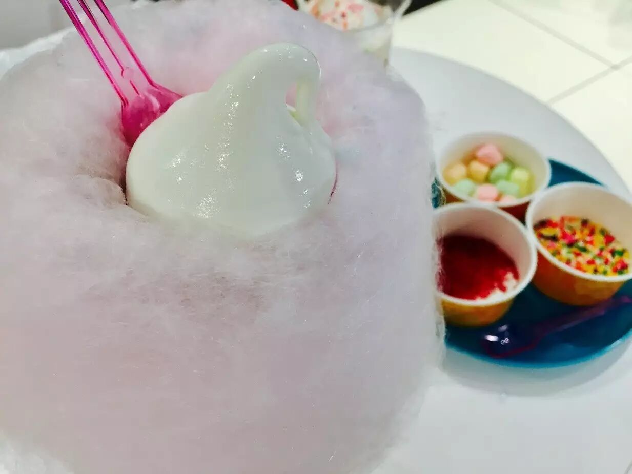 这次的主打商品是香浓牛奶云朵冰淇淋,就是在冰淇淋甜筒杯围上一圈棉花糖,就像在云朵中间突然放入一支冰淇淋似的。整个冰淇淋看起来很梦幻很可爱,淡蓝色和浅粉色,充满童话的色彩。