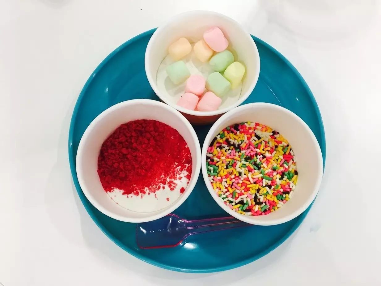 另加付费的话,还可以挑选3种配料装饰自己的冰淇淋。