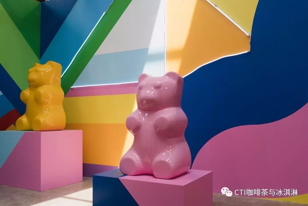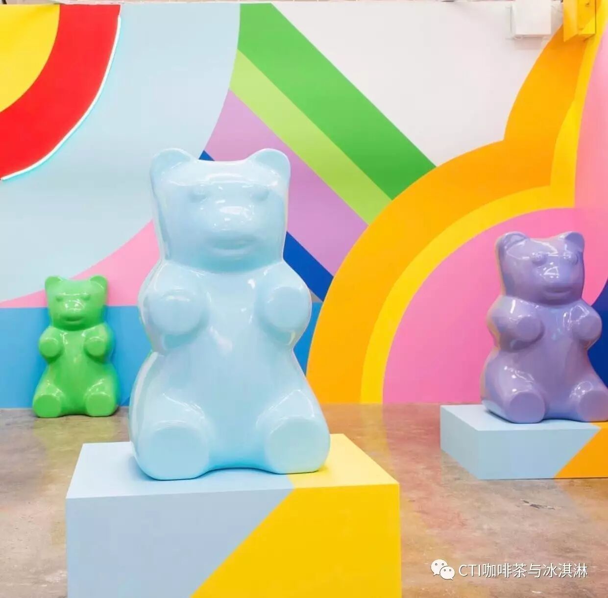 除了各色放大的熊型橡皮糖,房间中间的大冰柜填满了可食用的糖果熊。