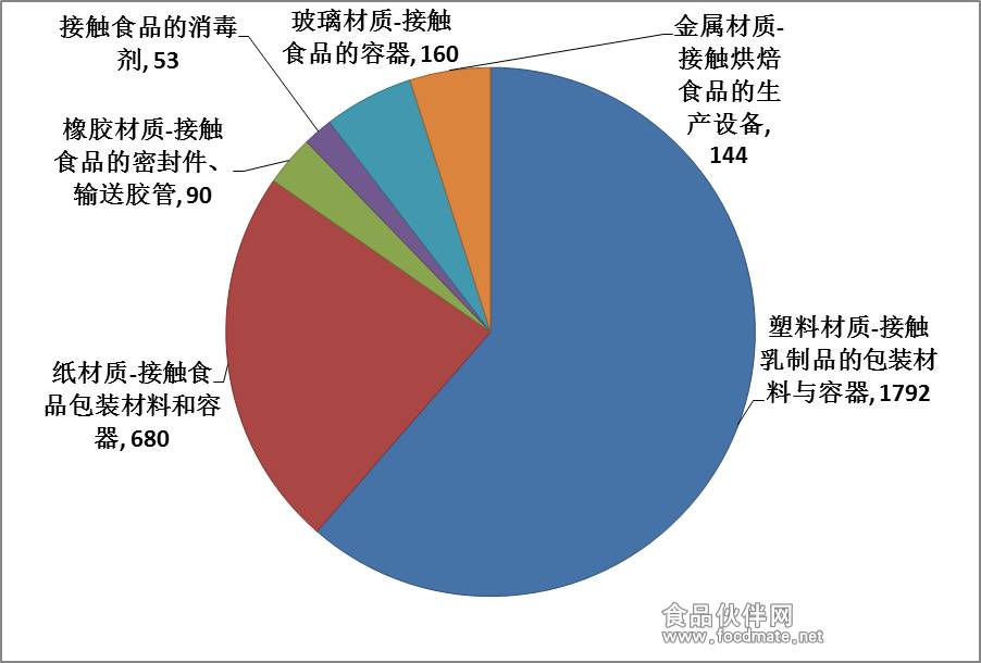 (三)按照抽查企业数划分,6类材质产品抽查企业情况如下:一是塑料材质-接触乳制品的包装材料与容器抽查了1374家企业生产的1792批次产品,包括非复合膜袋、复合膜袋、片材、容器、食品用工具;二是纸材质-接触食品的包装材料和容器抽查了661家企业的680批次产品,包括淋膜纸杯、食品包装纸、淋膜纸餐具、纸盒、纸袋、圆柱形复合罐、其他类(半透明纸、热封型茶叶滤纸、玻璃纸等)。三是橡胶材质-接触食品的密封件、输送胶管抽查了56家企业的90批次产品,主要包括橡胶密封件类(高压锅密封圈、密封圈、垫片等)和输送胶管类产品。四是接触食品的消毒剂抽查了46家企业的53批次产品,主要包括次氯酸钠、84消毒液、二氧化氯消毒剂、二氯异氰尿酸钠消毒剂、过氧乙酸消毒剂和其他消毒剂等。五是玻璃材质-接触食品的容器抽查了139家企业生产的160批次产品,主要包括啤酒瓶、白酒瓶、葡萄酒瓶、食品罐头瓶和玻璃杯。六是金属材质-接触烘焙食品的生产设备抽查了137家生产企业的144批次产品,主要包括商用电烤炉、商用电热铛、商用电炸炉、商用电蒸锅、电动类。