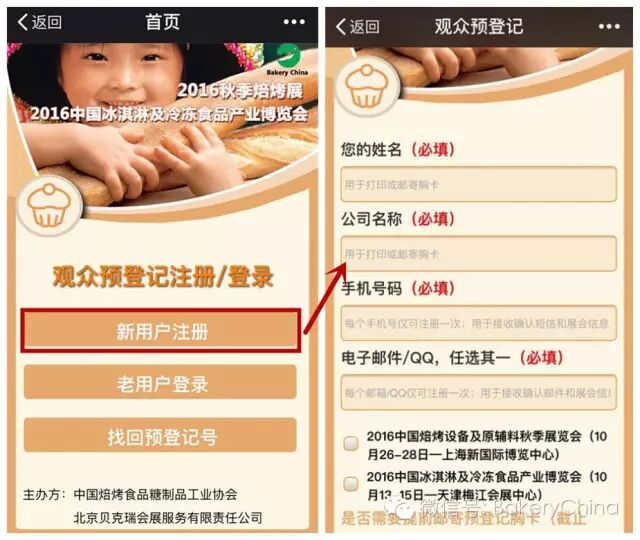 进入Bakery China微信公众号之后,点击【我要参观】,进入观众预登记页面!