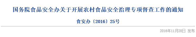 为深入贯彻执行新修订的《中华人民共和国食品安全法》和落实国务院食品安全办、公安部、农业部、工商总局、食品药品监管总局等五部门《关于进一步加强农村食品安全治理工作的意见》(食安办〔2015〕18号,以下简称《意见》),全面实现农村食品安全突出问题和风险隐患治理工作目标,净化农村食品生产经营环境,切实提高农村食品安全保障水平。按照国务院办公厅督查室关于组织有关部门开展专项督查的通知要求,国务院食品安全办决定对各地农村食品安全治理工作推进情况开展专项督查。现将有关事项通知如下: