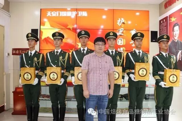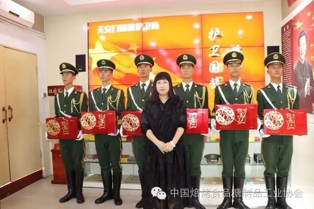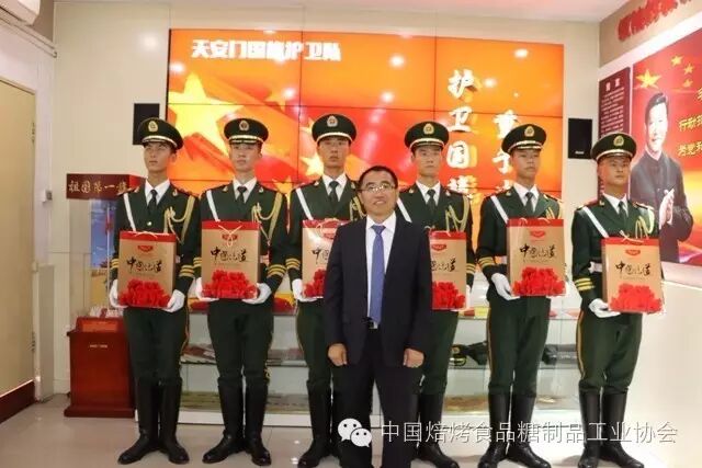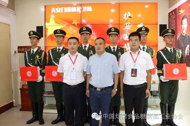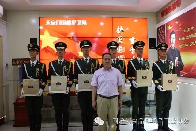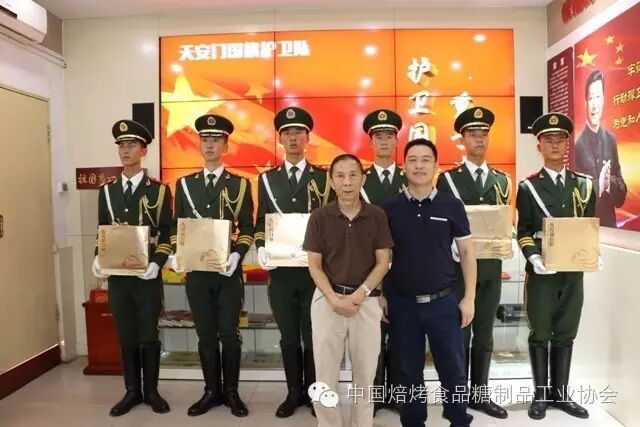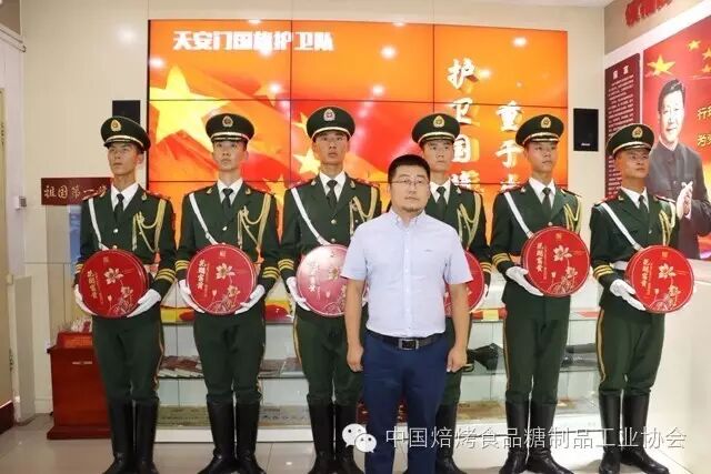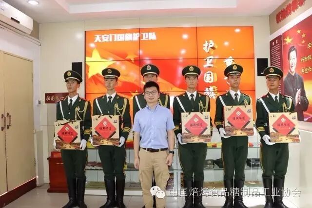 由中焙糖协原料与设备经销商委员会秘书长康恒平、糕点专业委员会副秘书长俞嘉毅带队,中焙糖协会员单位、行业知名企业新疆麦趣尔食品有限公司、浙江新美心食品工业有限公司、漳州天福茶业有限公司、中山港隆食品有限公司、商丘名代食品有限公司、山东康泉食品有限公司六家企业代表一行亲赴天安门国旗护卫队进行慰问,并送上味美香甜的中秋月饼,充分表达了对全体战士的中秋祝福和无限敬意。