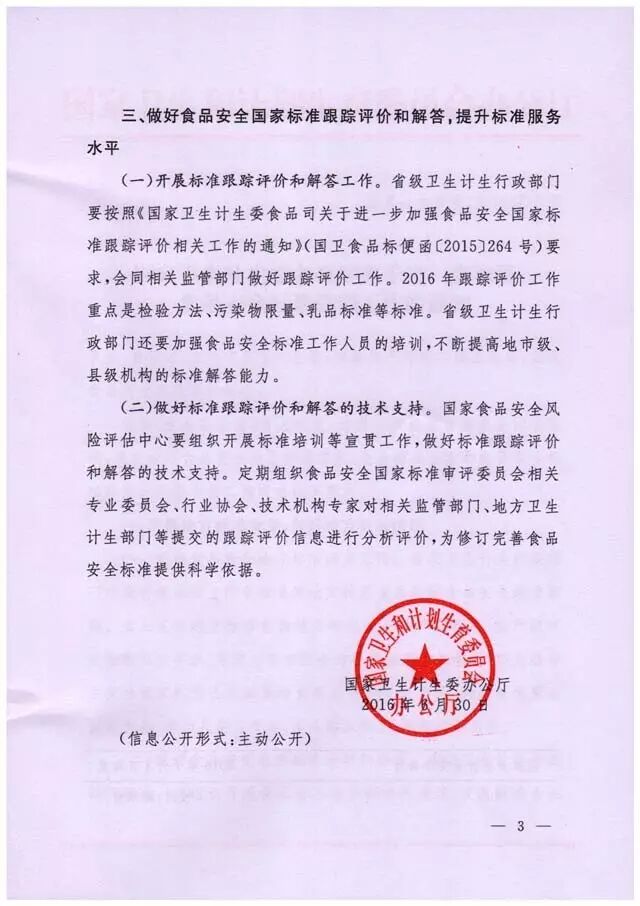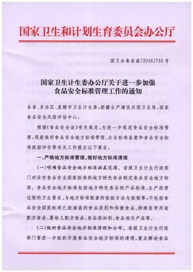 近日,国家卫生计生委办公厅印发了《关于进一步加强食品安全标准管理工作的通知》(国卫办食品函〔2016〕733号),现转发你们,请进一步强化食品安全标准制定与执行的衔接,加强食品安全监管工作。