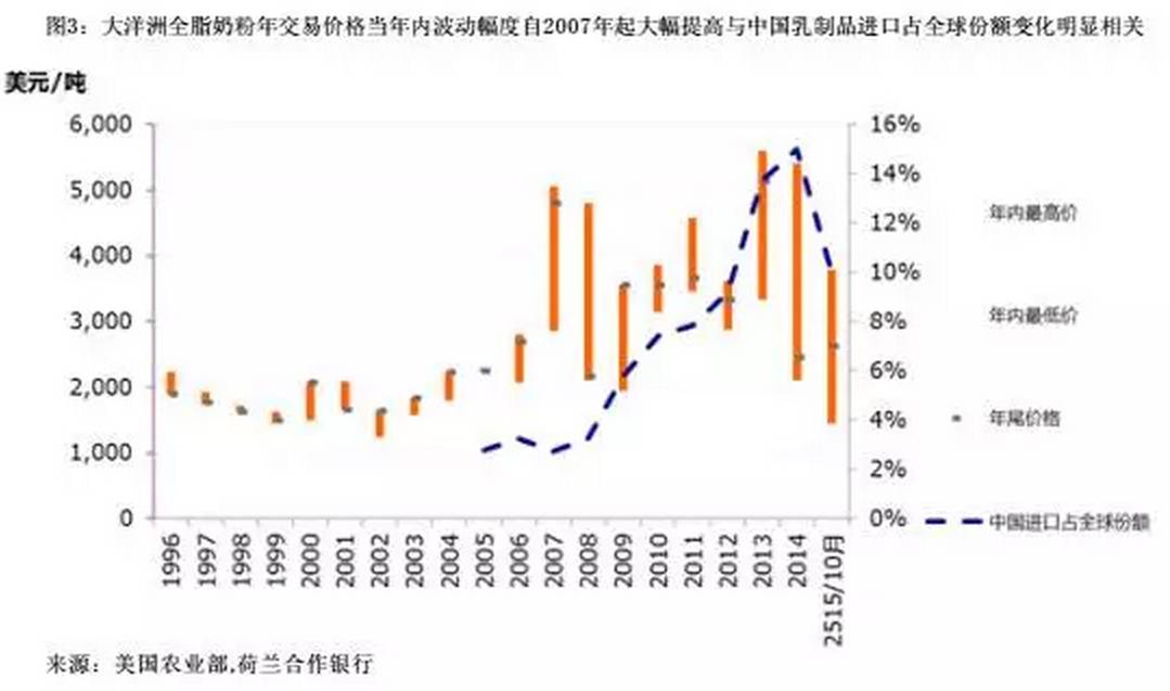 2014年第二季度开始,由于国内生产恢复,过量进口导致的库存压力,以及国内消费放缓,中国最终在下半年减少了从国际市场进口产品,这个过程恰逢全球主要乳制品生产的恢复,这些因素共同把价格在2015年内推向了10年来的低谷。从2007年起,特别是2008年起,以全脂奶粉为代表的乳制品大宗商品的价格波动性比之前更加剧烈。
