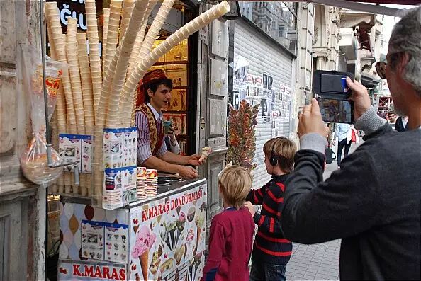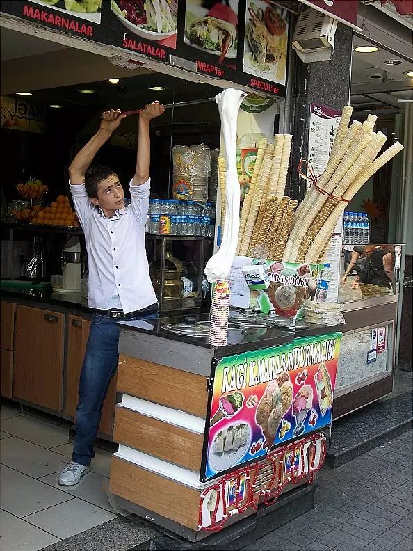 在土耳其城市的大街小巷,可以看到各式各样的冰淇淋专卖店和销售摊位。不少地方都能看到冰淇淋师傅现场制作。冰淇淋师傅时而挥舞着一个金属棍,时而捣一个金属桶,时而挂上一长条面团一样的东西,时而又会突然敲击一下挂在他们头顶的风格独特的铃铛。冰淇淋像拉面一样在师傅两手间拉抻、翻飞。