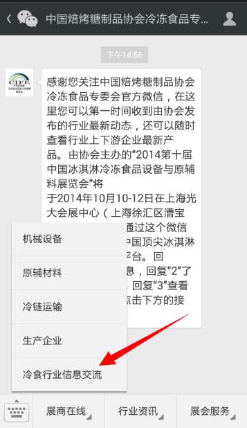 2、点击官方微信下方的接口,【展商在线】→【冷食行业信息交流】
