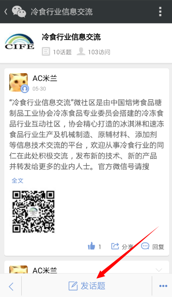 通过以上三种方式就可以进入到“冷食行业信息交流”微社区了,所有的用户都可以点击下方的发话题,在这里进行发贴,回帖,点赞,上传图片。
