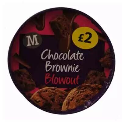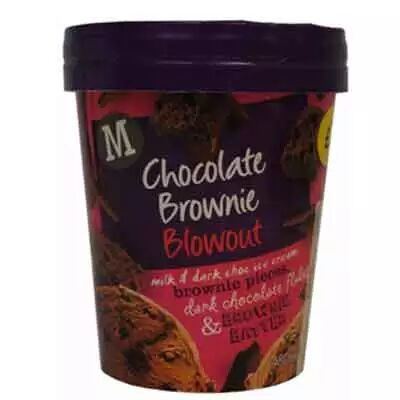 M的巧克力布朗尼冰淇淋含有牛奶和黑巧克力冰淇淋、布朗尼碎块、黑巧克力薄片和布朗尼糊。这款素食产品零售规格为一个480ml可回收纸杯。